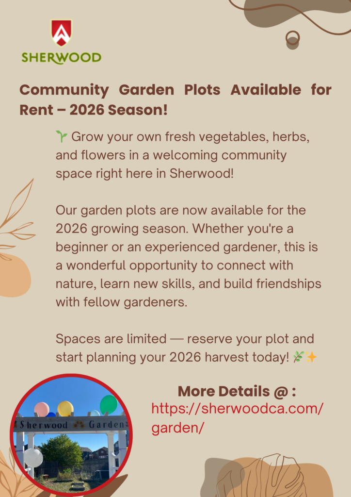 Grow your own fresh vegetables, herbs, and flowers in a welcoming community space right here in Sherwood! Our garden plots are now available for the 2026 growing season. Whether you’re a beginner or an experienced gardener, this is a wonderful opportunity to connect with nature, learn new skills, and build friendships with fellow gardeners.